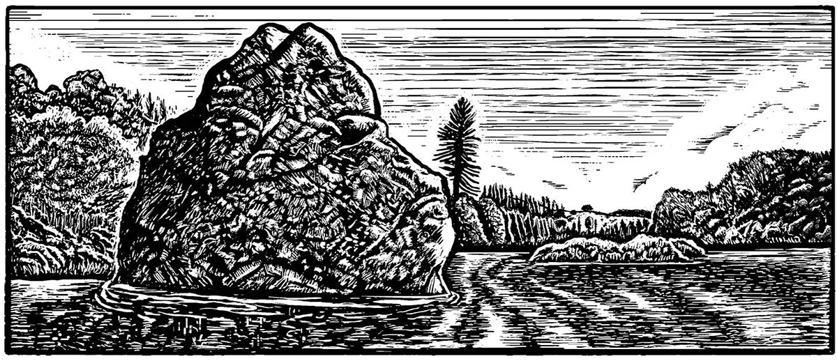 Nestled on the south fork of the American River in Lotus, California, Gorilla Rock added an adventurous twist to the collection. I aimed to capture the spirit of exploration and the thrill of outdoor escapades in this dynamic and rugged setting through linocut artistry.