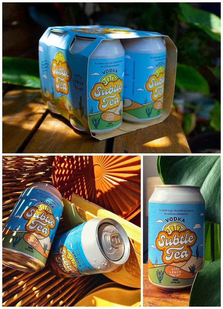 24 pack packaging design with the can designs and illustration. Photo courtesy of www.subtletea.com.au
